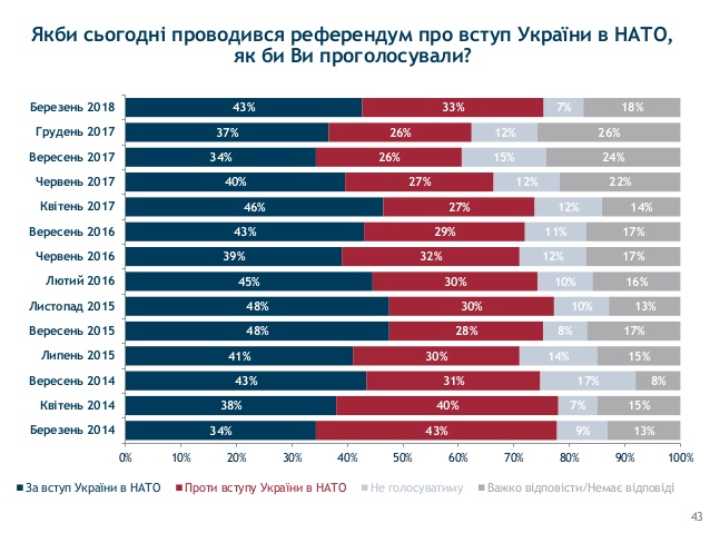 В марте стало пропорционально больше и тех, кто поддерживает движение в НАТО - в основном за счет неопределившихся. При этом с 2015 года число сторонников атлантической интеграции уменьшилось - с 48% до 43%.