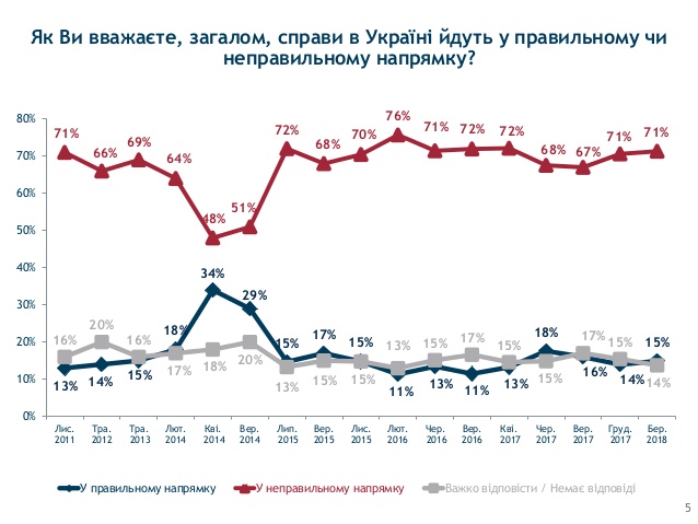 Согласно исследованию, 71% украинцев считает, что Украина движется в неправильном направлении. Для сравнения, в апреле 2014 года скептиков было всего 48%.