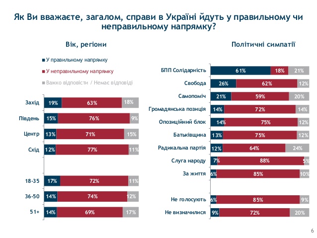 Среди тех, кто считает, что все идет в правильном направлении, больше всего избирателей Блока Петра Порошенко. 61% поклонников этой политической силы уверен, что страна идет, куда надо.