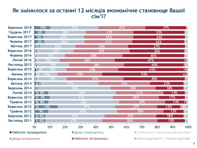 Так, Петру Порошенко в марте не доверяли более 80% процентов опрошенных, а доверяют - 13%. Это самый высокий показатель негатива за последние несколько месяцев.