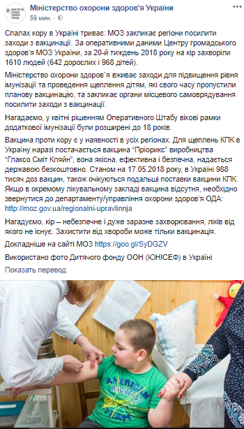 "По оперативным данным Центра общественного здоровья Минздрава Украины, за 20-ю неделю 2018 года корью заболели 1,610 тыс. чел. (642 взрослых, 968 детей)", - говорится в сообщении.