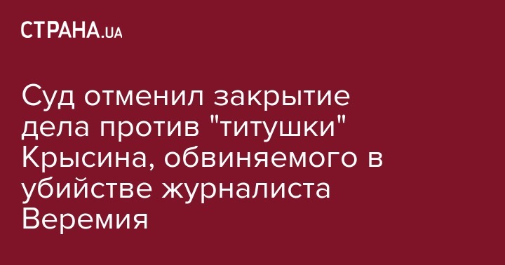 Печерский районный суд Киева отменил постановление Генеральной прокуратуры о закрытии уголовного производства против руководителя "титушек" Юрия Крысина, которого обвиняют в  убийстве журналиста Вячеслава Веремия 18 февраля 2014 в центре Киева. Об этом на своей странице в соцсети сообщила адвокат семей пострадавших активистов Евгения Закревская.