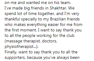Я нашел много друзей в "Шахтере". Мы проводили много времени вместе, и я особенно благодарен моим бразильским друзьям, которые сделали все гораздо легче для меня сразу же после приезда. Хочу сказать спасибо всем, кто работает в клубе – массажистам, докторам, физиотерапевтам.