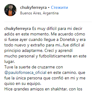 Аргентинский нападающий Факундо Феррейра попрощался с игроками, тренерами, руководством и болельщиками футбольного клуба "Шахтер".