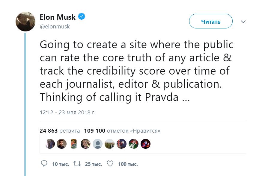 "Собираюсь создать сайт, на котором публика может оценивать правдивость любой статьи и отслеживать рейтинг доверия с течением времени к каждому журналисту, редактору и публикации. Думаю о том, чтобы назвать его "Pravda", - написал Маск.
