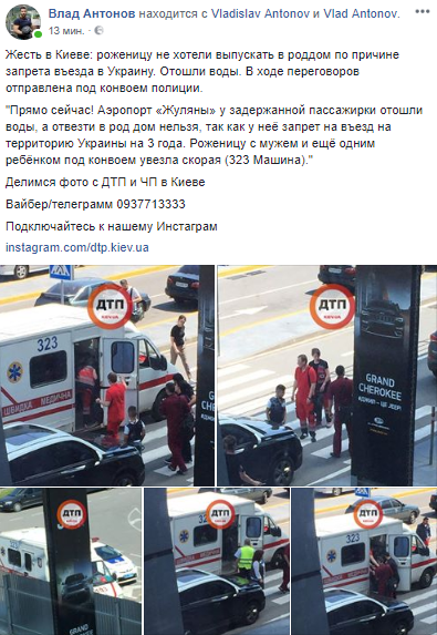 "Жесть в Киеве: роженицу не хотели выпускать в роддом по причине запрета въезда в Украину. Отошли воды. В ходе переговоров отправлена под конвоем полиции.