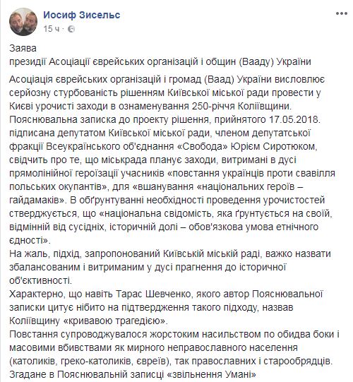 Об этом сказано в заявлении президиума Ваада Украины, которое приводит на своей странице в Facebook ее председатель Йосиф Зисельс.