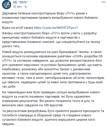 В Черниговской области провели испытания нового боевого модуля, который способен поражать неподвижные и движущиеся бронированные цели с разными типами брони. Об этом сообщает пресс-служба конструкторского бюро "Луч" на своей странице в Facebook.