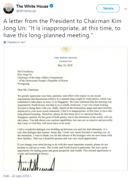 Президент США Дональд Трамп объявил об отказе от встречи с лидером КНДР Ким Чен Ыном, которая, по предварительным данным, должна была состояться в Сингапуре 12 июня. Об этом стало известно из письма главы Белого дома, которое было опубликовано американской администрацией в Twitter.