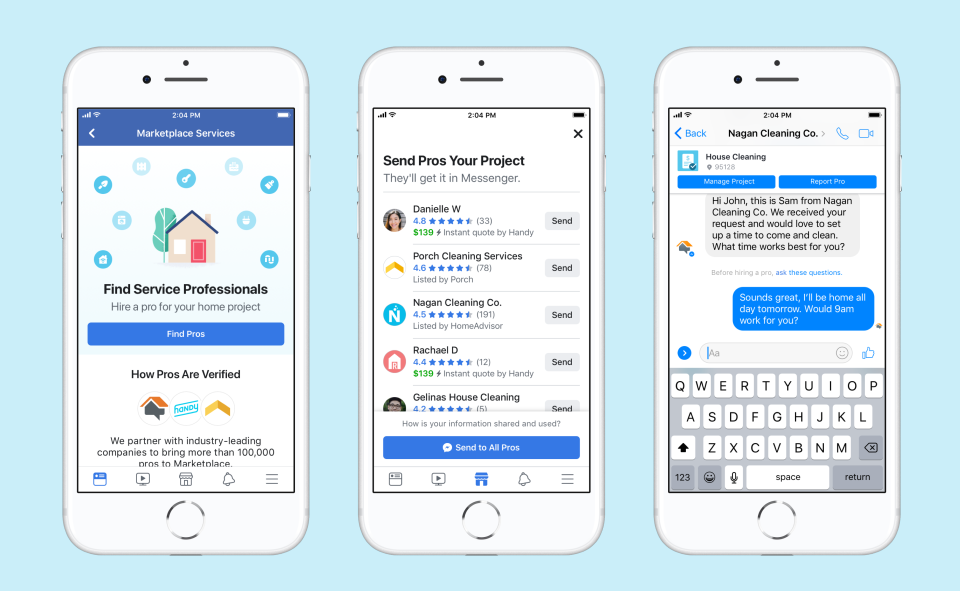 Пользователи смогут найти мастеров по ремонту и уборке дома, сантехников и других специалистов. Facebook сотрудничает с компаниями Handy, HomeAdvisor и Porch, в которых работают тысячи профессиональных подрядчиков. Об этом говорится в сообщении социальной сети.