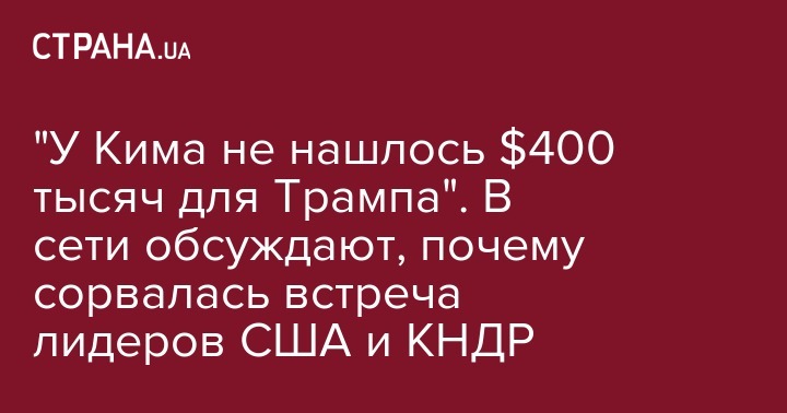 Кроме того тема уже стала поводом для шуток в Сети - блогеры иронизируют, что Трамп отказал Киму во встрече, потому что у того не оказалось 400 тысяч долларов. По аналогии со скандалом на тему встречи Порошенко и Трампа, за которую украинский президент якобы заплатил именно эту сумму.