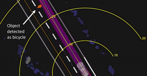 Первыми пешехода обнаружили лидар и радар, это произошло за шесть секунд до столкновения. Изначально автомобиль классифицировал ее как неопознанный объект, затем как автомобиль, а после как велосипед (пешеход переходила дорогу, толкая рядом с собой велосипед с пластиковыми пакетами).