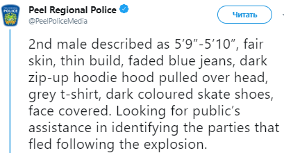 Полиция Канады разыскивает двух мужчин, которых подозревают в подрыве самодельной бомбы в городе Мисиссога. Об этом сообщается в микроблоге полиции района Пил в Тwitter.
