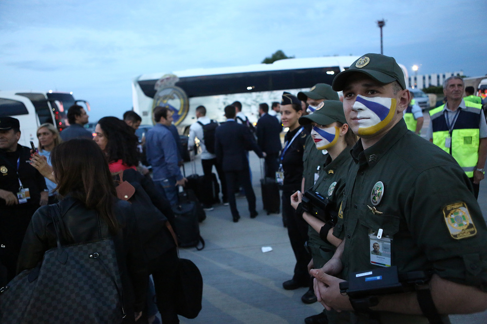 Футболистов Реала и Ливерпуля, участников финального матча Лиги чемпионов УЕФА, которые прибыли в Киев 24 мая вечером, встречали украинские пограничники, лица которых были раскрашены в цвета флагов двух команд-финалистов.