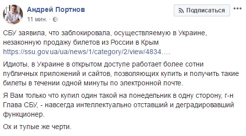 "Идиоты, в Украине в открытом доступе работает более сотни публичных приложений и сайтов, позволяющих купить и получить такие билеты в течении одной минуты по электронной почте. Я Вам только что купил один такой на понедельник в одну сторону, г-н Глава СБУ, - навсегда интеллектуально отставший и деградировавший функционер. Ох и тупые же черти", - написал он.