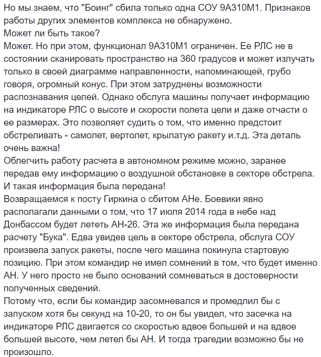 Возвращаемся к посту Гиркина о сбитом АНе. Боевики явно располагали данными о том, что 17 июля 2014 года в небе над Донбассом будет лететь АН-26. Эта же информация была передана расчету "Бука". Едва увидев цель в секторе обстрела, обслуга СОУ произвела запуск ракеты, после чего машина покинула стартовую позицию. При этом командир не имел сомнений в том, что будет именно АН. У него просто не было оснований сомневаться в достоверности полученных сведений.