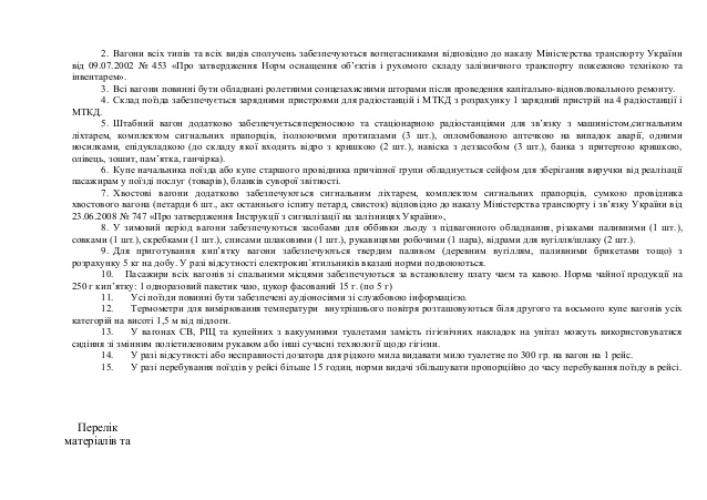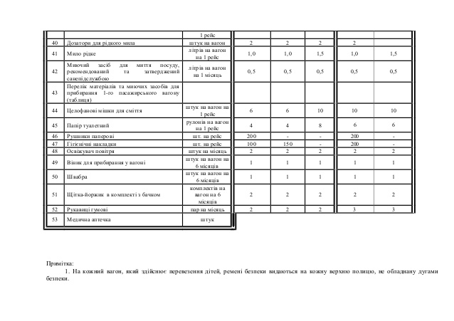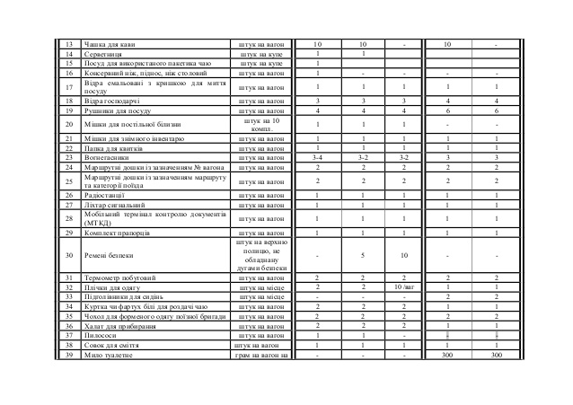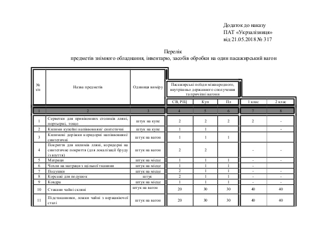 С 21 мая 2018 внесены изменения в список съемного оборудования, инвентаря, средств обработки, которые должны приходиться на один пассажирский вагон "Укрзализныци".