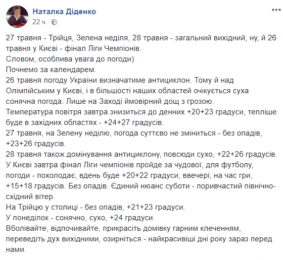 "27 мая - Троица, Зеленая неделя, 28 мая - общий выходной, ну, и 26 мая в Киеве - финал Лиги Чемпионов. Словом, особое внимание к погоде). Начнем по календарю", пишет синоптик.