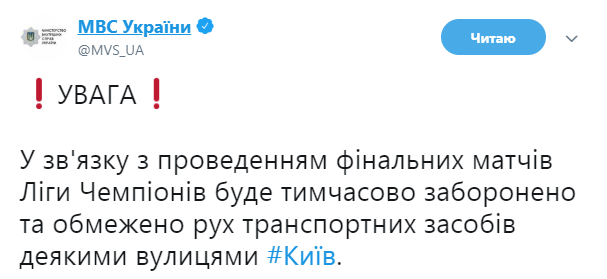 В Киеве из-за матча финала Лиги чемпионов перекроют движение на некоторых столичных улицах.