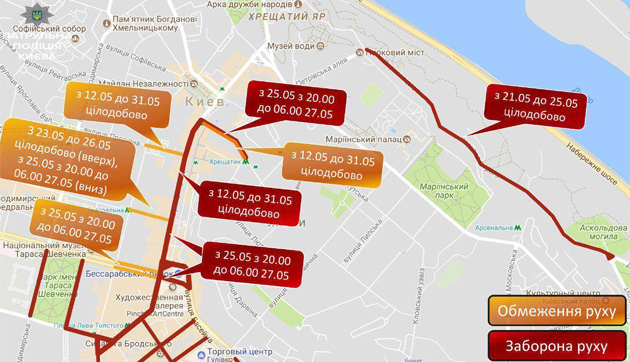 - ул. Крещатик (от ул. Богдана Хмельницкого к Бессарабской площади), запрещение — 25.05.2018 с 20:00 до 06:00 27.05.2018;