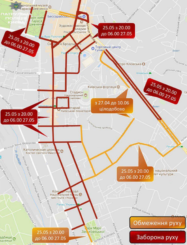 - ул. Владимирская (от ул. Льва Толстого до б-ра Тараса Шевченко), ул. Терещенковская (от б-ра Тараса Шевченко до ул. Льва Толстого), ул. Льва Толстого (от ул. Терещенкивской до площади Льва Толстого),  площадь Льва Толстого, ул. Большая Васильковская (от Бессарабской площади до ул. Тверской), ул. Жилянская (от ул. Антоновича до ул. Шота Руставели), ул. Шота Руставели (от ул. Жилянской до ул. Бассейной) - запрещение — 25.05.2018 с 20:00 до 06:00 27.05.2018;
