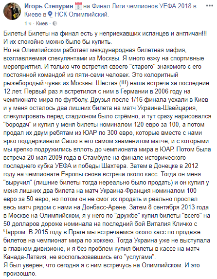 По словам Степурина, официальные билеты продаются по 700 евро с табличками "I need а ticket" у НСК "Олимпийский", а лишние билеты скупаются у англичан и испанцев.