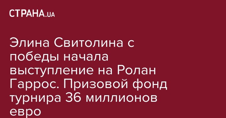 Украинская теннисистка Элина Свитолина победила на открытии Ролан Гаррос в Париже. Общий призовой фонд Открытого чемпионата Франции, второго турнира серии Grand Slam - 36 миллионов евро.
