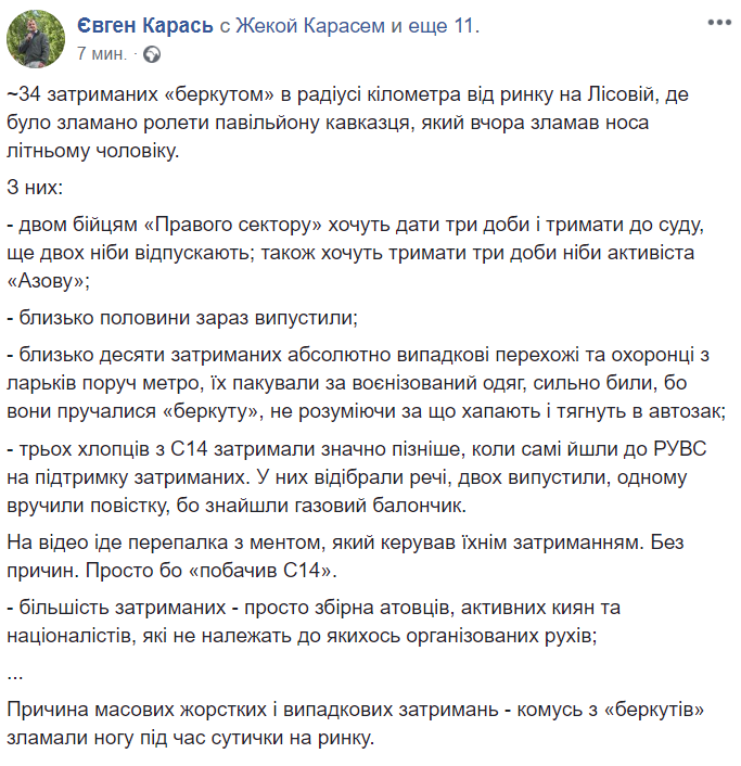 Позже Карась рассказал, какие организации участвовали, по его данным, в столкновениях (снова подчеркнув, что С14 ни при чем).