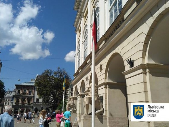 "В частности, у городской ратуши виднеется государственный сине-желтый и красно-черный флаг национально-освободительной борьбы украинского народа. Они развеваются на флагштоках при входе", - сообщили в городском совете Львова.