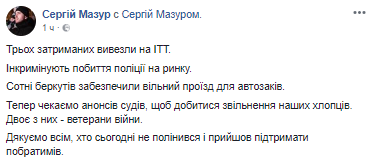 Также активист организации С14 Сергей Мазур сообщил, что "трех задержанных вывезли на ИВС" на своей странице в Facebook.