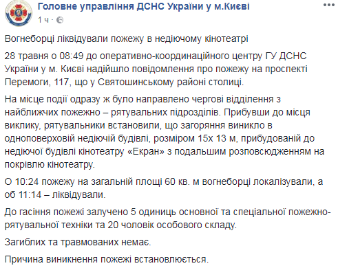 Спасатели потушили пожар в одном из старейших кинотеатров Киева -"Экран". Огонь вспыхнул в здании, возле станции метро "Житомирская" около 8:45 понедельника, 28 мая.