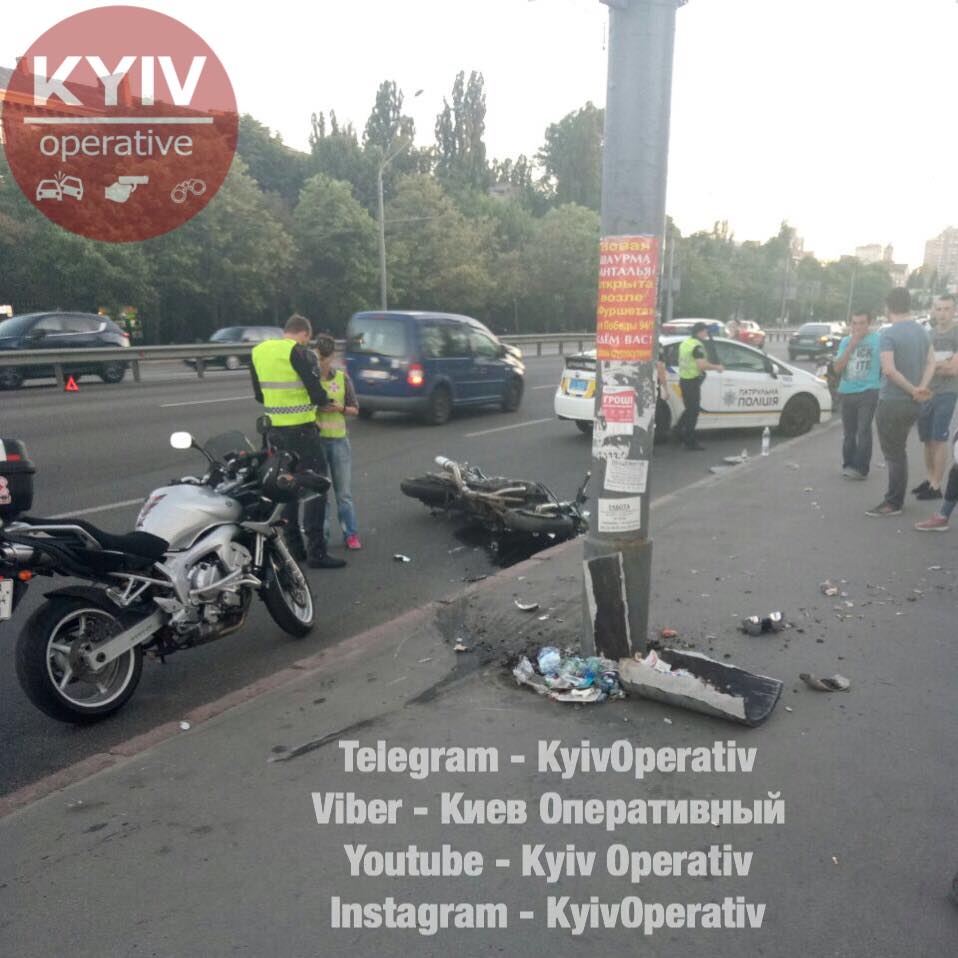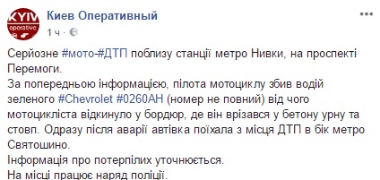 По предварительной информации, пилота мотоцикла сбил водитель зеленого Chevrolet, от чего мотоциклиста отбросило в бордюр, где он врезался в бетона урну и столб. Сразу после аварии автомобиль уехала с места ДТП в сторону метро Святошино. По информации свидетелей, автомобиль мог также быть марки Citroën.
