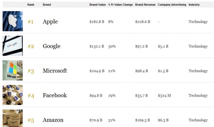 Первая пятерка самых дорогих компаний по версии Forbes полностью состоит из представителей IT-отрасли - ее замыкают Facebook (94,8 млрд долларов) и Amazon (70,9 млрд долларов).