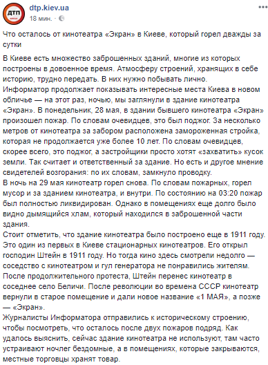 В Киеве дважды за последние сутки горело здание, где раньше размещался кинотеатр "Экран". Это постройка 1911 года сейчас пребывает в заброшенном состоянии. Авторы поста не исключают, что причиной пожара стал поджог. А его "ноги растут" со стороны застройщиков, которые облюбовали этот участок земли. Об этом на своей странице в Facebook пишет ресурс dtp.kiev.ua. Также в соцсети опубликован репортаж о последствиях пожара.