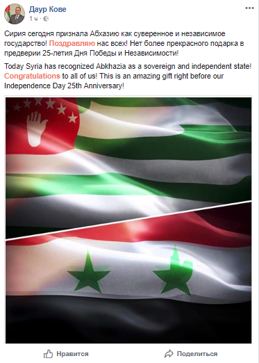 Во вторник, 29 мая, Сирия официально заявила о признании и установлении дипломатических отношений с непризнанными Южной Осетией и Абхазией.