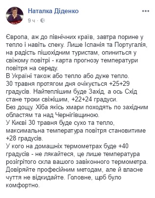"Европа, вплоть до северных краев, завтра погрузится в тепло и даже жару. Только Испания и Португалия, на радость пешим туристам, окажется в свежем воздухе… В Украине также или тепло, или очень тепло", – сообщила синоптик Наталья Диденко у себя в Facebook.