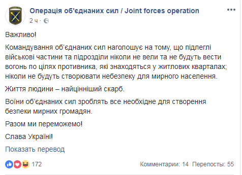 "Командование объединенных сил подчеркивает, что подчиненные воинские части и подразделения никогда не вели и не будут вести огонь по целям противника, находящимся в жилых кварталах; никогда не будут создавать опасность для мирного населения", - говорится в опубликованном сообщении на странице операции объединенных сил (ООС) во вторник, 29 мая.