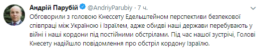 Также Парубий написал, что обсудили с главой Кнессета перспективы безопасности сотрудничества между Украиной и Израилем, поскольку оба государства находятся в состоянии войны и их границы под постоянными обстрелами.