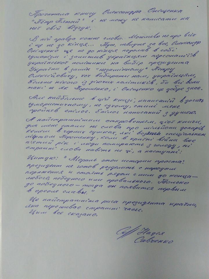 Савченко написала рецензию на книгу Онищенко "Петр Пятый", которую прочитала в тюрьме