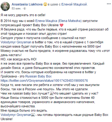 И знаете что, боксы, которые изображены на картинке в twitter в Гройсмана - это Russian Baby Box. Чем же russian baby box лучше? Что мешает сделать их у нас?