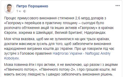 "Процесс принудительного исполнения взыскания 2,6 млрд долларов с "Газпрома" перешел в практическую плоскость - сегодня было начато обременение акций и других активов "Газпрома" в странах Европы, в частности в Швейцарии, Великобритании, Нидерландах", - отметил Президент.
