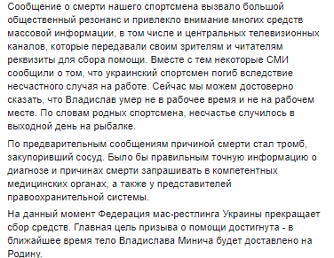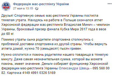 Также уточняется, что семья умершего столкнулась с проблемой доставки тела спортсмена из Польши, где он работал, на родину - в Украину. Федерация открыл сбор средств для помощи семье Владислава Минча.