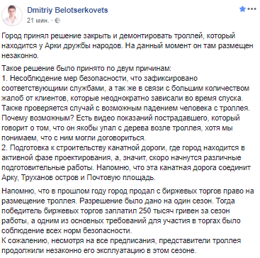 Напомним, 25 мая при переправе на канатной дороге через Днепр травмировался человек. Об этом сообщали очевидцы в Facebook. Поездка на тросе от арки Дружбы Народов к Трухановому острову чуть не стоила человеку жизни. Трос оборвался, и человек упал на песок.