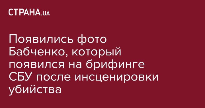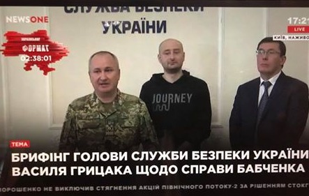 Появились фото российского журналиста Аркадия Бабченко на брифинге СБУ, в ходе которого глава ведомства Василий Грицак заявил, что история с убийством Бабченко была частью спецоперации.