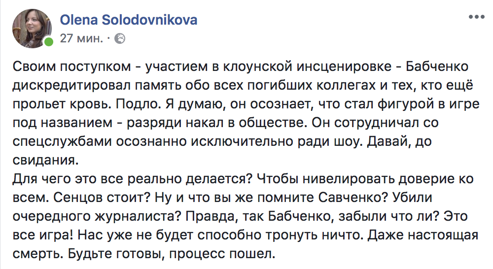 "Своим поступком - участием в клоунской инсценировке - Бабченко дискредитировал память обо всех погибших коллегах и тех, кто ещё прольет кровь, - пишет журналист Елена Солодовникова. - Подло. Я думаю, он осознает, что стал фигурой в игре под названием - разряди накал в обществе. Он сотрудничал со спецслужбами осознанно исключительно ради шоу. Давай, до свидания. Для чего это все реально делается? Чтобы нивелировать доверие ко всем. Сенцов стоит? Ну и что вы же помните Савченко? Убили очередного журналиста? Правда, так Бабченко, забыли что ли? Это все игра! Нас уже не будет способно тронуть ничто. Даже настоящая смерть. Будьте готовы, процесс пошел".