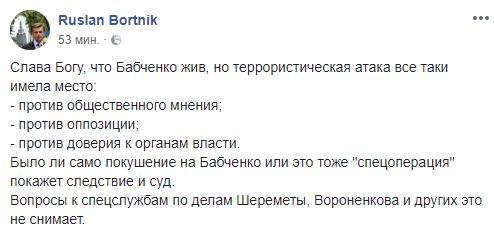 Политический аналитик Руслан Бортник считает, что эта операция не снимает вопросов к власти: "Слава Богу, что Бабченко жив, но террористическая атака все таки имела место: