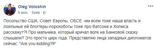 Политический эксперт Олег Волошин пишет о том, как теперь Украина выглядит в глазах Запада: "Посольство США, Совет Европы, ОБСЕ - им всем тоже наша власть и лояльные ей блоггеры-порохоботы тоже про Ватсона и Холмса расскажут?! Про мальчика, который кричал волк на Банковой сказку слышали? Это просто цирк года. Представляю лица западных дипломатов сейчас: "Are you kidding?!"