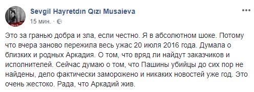 Журналист Севгиль Мусаева шокирована произошедшим: "Это за гранью добра и зла, если честно. Я в абсолютном шоке. Потому что вчера заново пережила весь ужас 20 июля 2016 года. Думала о близких и родных Аркадия. О том, что вряд ли найдут заказчиков и исполнителей. Сейчас думаю о том, что Пашины убийцы до сих пор не найдены, дело фактически заморожено и никаких новостей уже год. Это очень жестоко. Рада, что Аркадий жив".