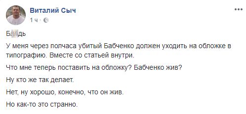 Журналист Виталий Сыч в сердцах выругался в Facebook, что эта новость испортила обложку завтрашнего номера журнала: "Б**дь. У меня через полчаса убитый Бабченко должен уходить на обложке в типографию. Вместе со статьей внутри.