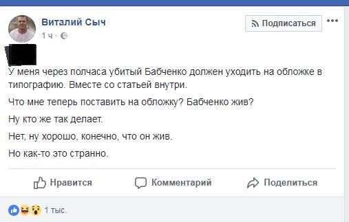 "У меня через полчаса убитый Бабченко должен уходить на обложке в типографию. Вместе со статьей внутри. Что мне теперь поставить на обложку? Бабченко жив? Ну кто же так делает. Нет, ну хорошо, конечно, что он жив. Но как-то это странно" - написал главред "Нового времени" Виталий Сыч в Facebook.